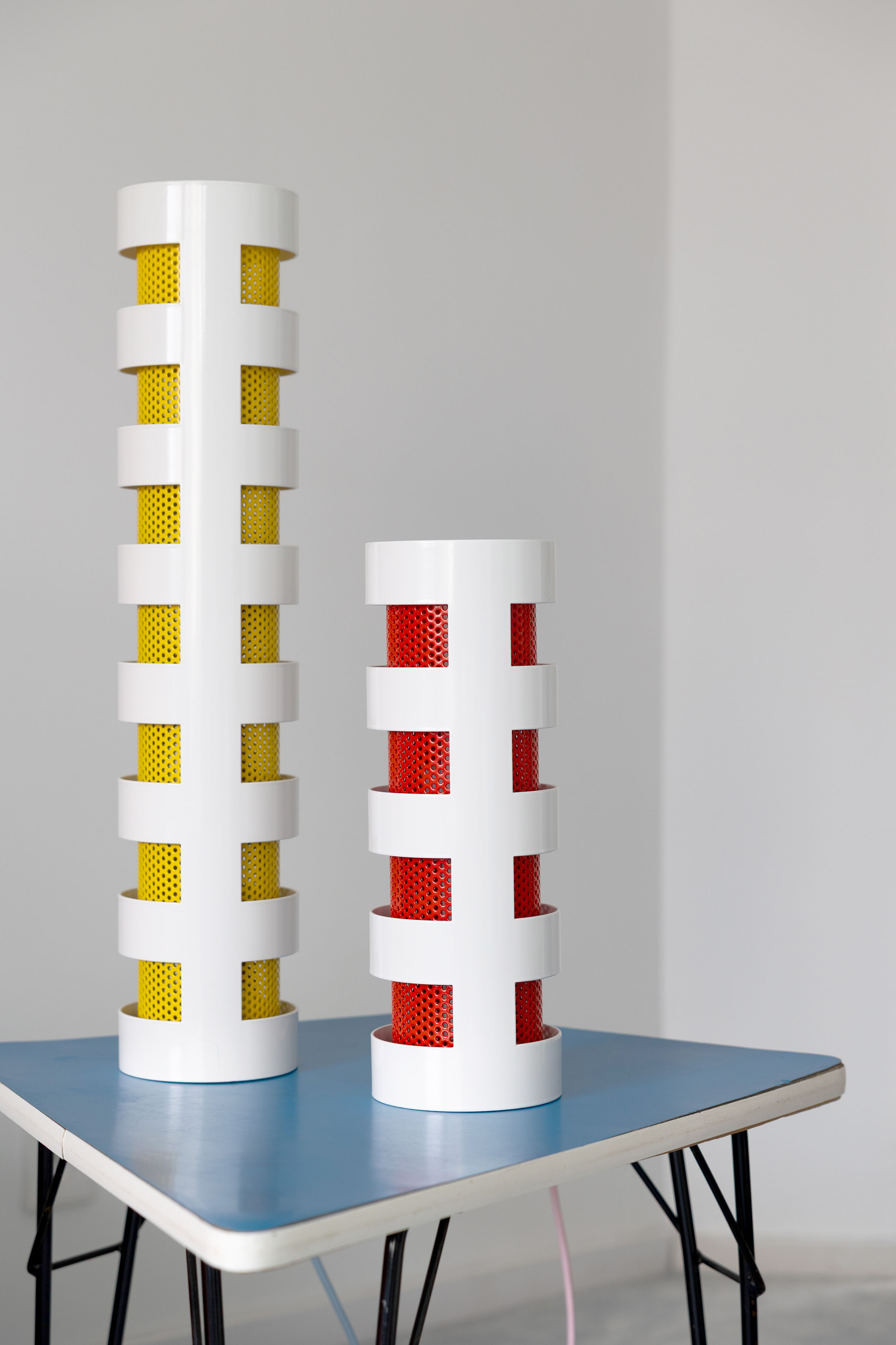 The Perfo lamps are made from readymade objects: a closed tube and a perforated tube originally designed as a car exhaust. Their dimensions follow the size of the light source. The simple construction, without any welding, makes the lamps easy to assemble and take apart. Since each lamp consists of two components, different colour combinations can be created. The result is a gentle and poetic spread of light, reminiscent of a starry sky.